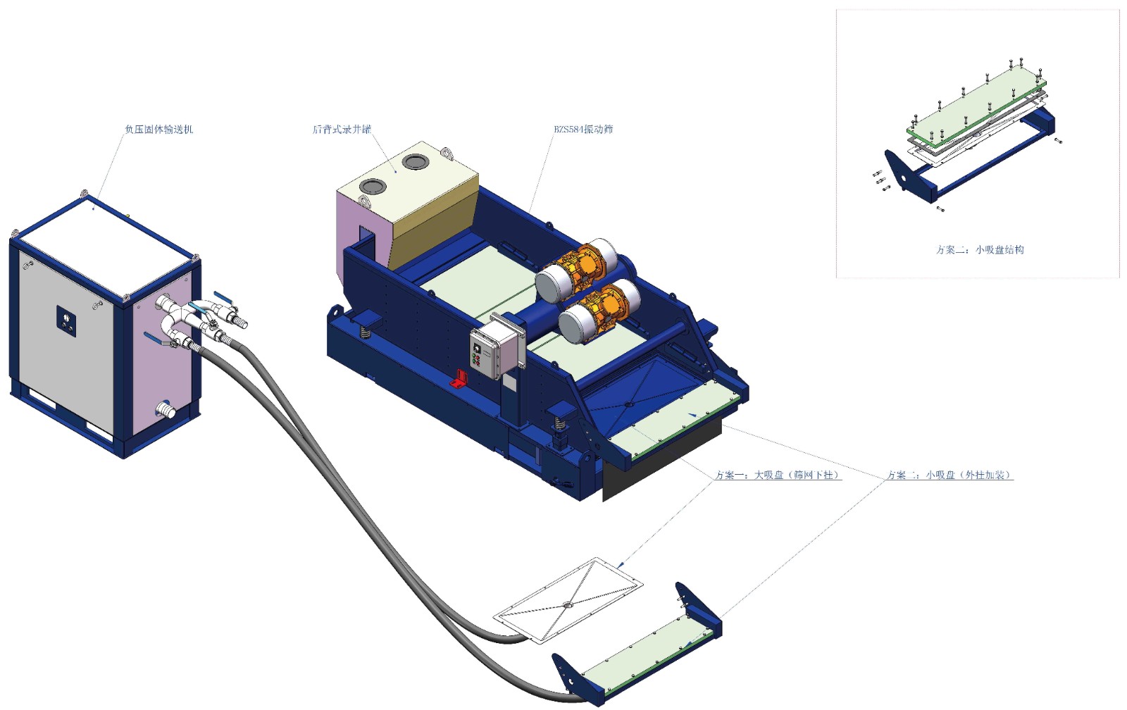 北鉆真空負壓振動篩是一種真空抽吸系統的振動篩分設備,真空負壓振動篩通過在振動篩最后一張篩網下面安裝一套真空吸附裝置,通過脈動氣流形成一定頻率的真空抽吸,從而提高鉆井液的回收,降低待處理混合液固液分離的難度,有限降低處理后鉆井巖屑固相物料20-30%的含液量,提高整體鉆井工作效率,大幅減少了鉆井廢棄物量從而降低了后續廢棄物的處置成本。 FBZS系列真空負壓振動篩技術參數 型號 FBZS583 FBZS584 振動軌跡 直線型 處理量 ≤120m³/h ≤140m³/h 電機功率 2×2.2kW 篩網數量 3 4 篩網規格 585×1165mm 585×1165mm 激振強度 ≥7.5G 雙振幅 4.5~6.0mm 篩箱調節角度 -1°~5° 氣源壓力要求 0.55MPa-0.69MPa(5.6-7.0kgf/cm² 用氣量 7.9m³/min 泥回收效率 30%-50% 防爆標準 ExdIIBt4/IECEX/A-TEX 重量 1420kg 1570kg 外形尺寸 2410×1978×1415mm 3004×1978×1415mm 備注 氣動自動控制,無需電源,吸排時間可調 北鉆真空負壓振動篩特點和優勢: 1. 可以用于油基泥漿(BOM)、水基泥漿(WBM)和復合基泥漿(SBM)的泥漿凈化處理; 2. 可以用于高粘度鉆井泥漿減量化處理,泥漿不落地鉆屑干燥處理,高粘度高含固量油泥粗過濾處理,通過排放更干燥的鉆屑,能夠減少鉆井廢棄物運輸和處理成本; 3. 負壓振動篩可以回收更多鉆井液,減少鉆井廢棄物的排放量,基于不同的鉆井速度,每天每臺振動篩大約能夠多回收約8m³左右的有用鉆井液; 4. 水基泥漿和油基泥漿整個處理過程不糊篩網; 5. 通過配套真空抽吸裝置,負壓振動篩可以安裝更高目數的篩網不用擔心跑漿問題,省去除砂器除泥器和對應的供漿泵,達到節能降耗; 6. 北鉆負壓吸附裝置幾乎無需額外占地面積,滿足海洋平臺空間需求。